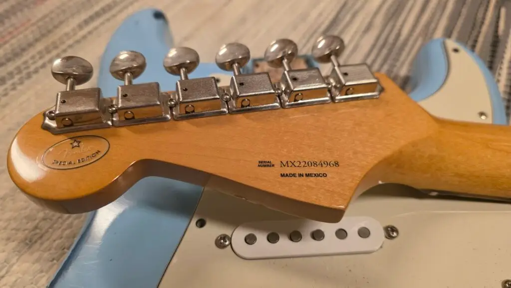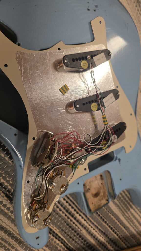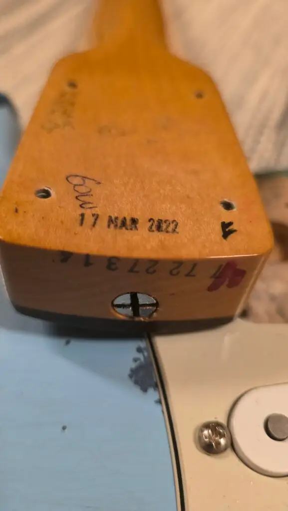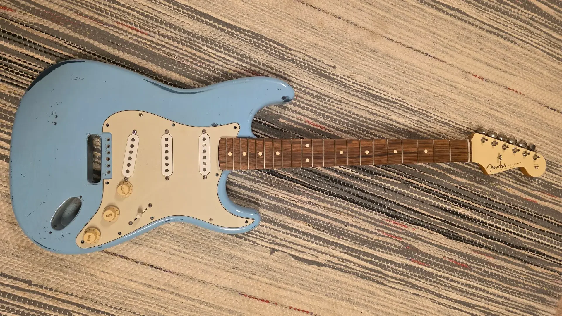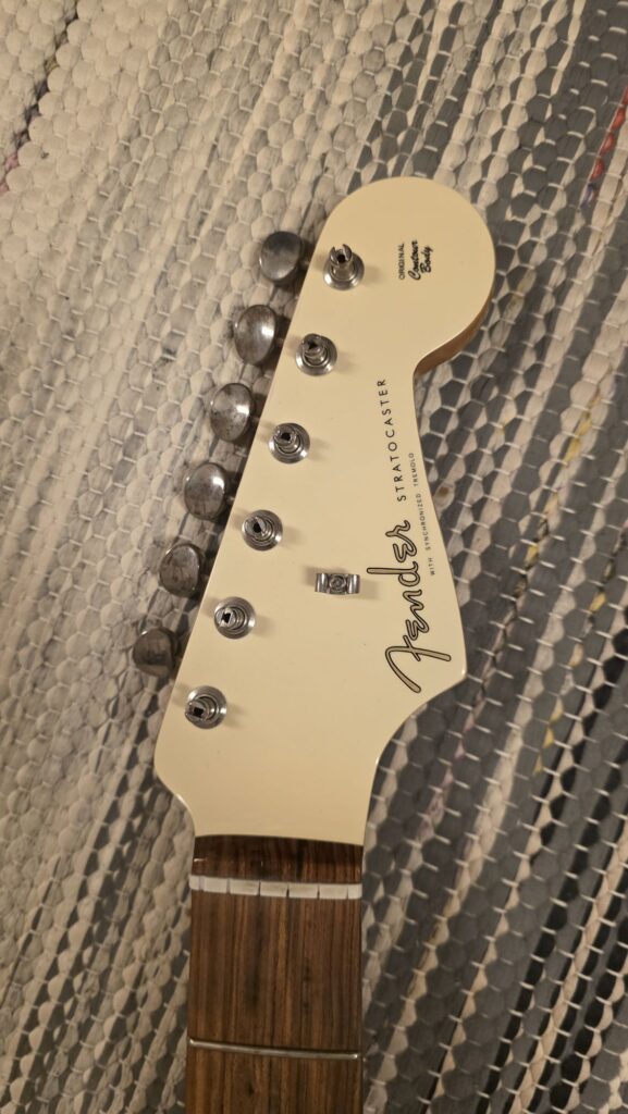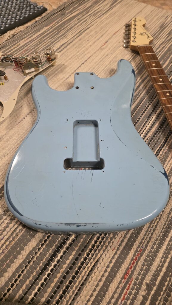 Myyn osina Fender Stratocaster Relic Sonic Blue over Lake Placid Metallic Blue 1997 (Professional Refin), body on parhaan tietoni mukaan US. Kaula on vaahtera-rosewood vintage nauhoilla, sekä harvinaisempi valkea headstock, kaula on made in Mexico v.2022.